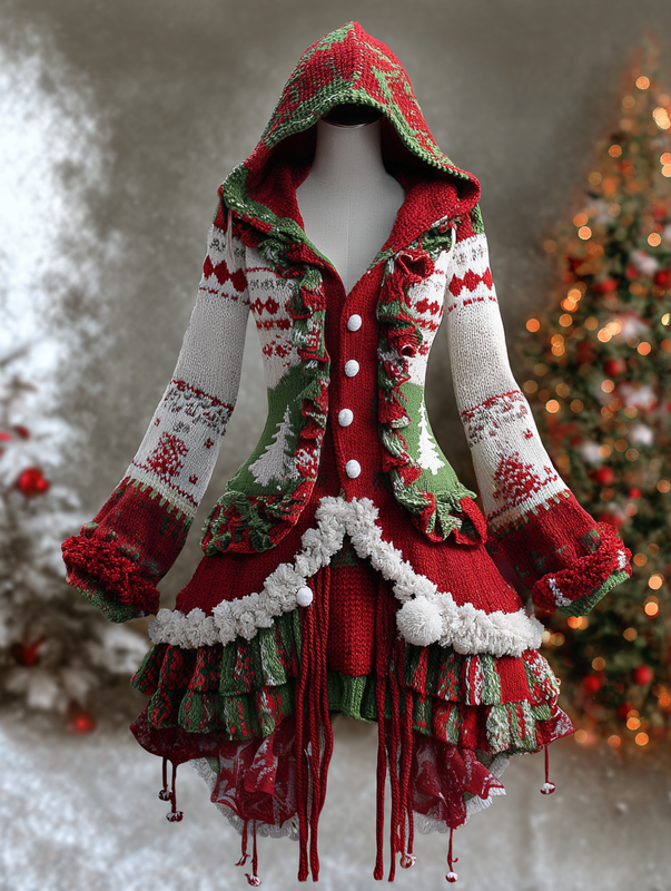 CHRISTMAS THEMED ELEGANT CONTRAST COLOR KNITTED HOODED DRESS f630