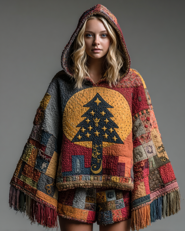 Christmas themed elegant contrasting color hooded cape top coat 4074