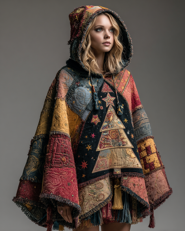 Christmas themed elegant contrasting color hooded cape top coat 9660