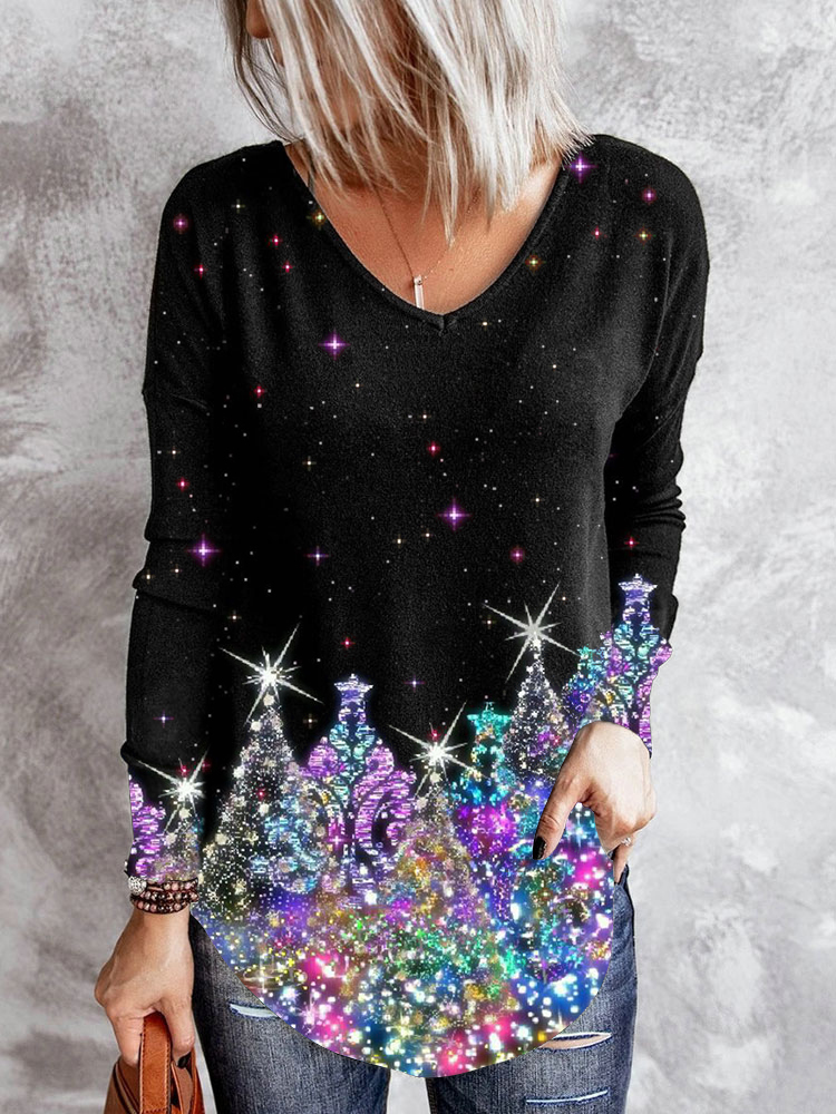 Christmas Tree V Neck Casual Long Sleeve T-Shirt
