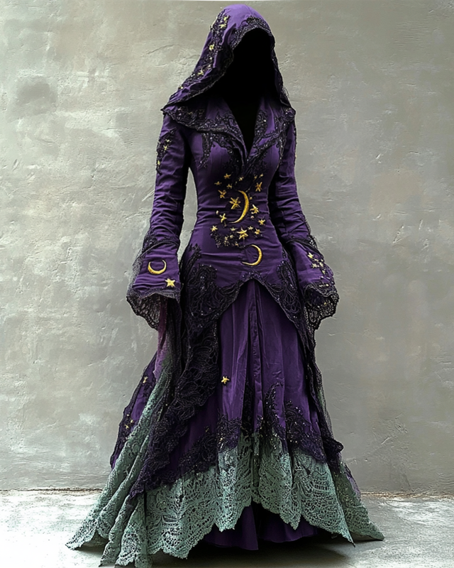 Star And Moon Theme Embroidered Lace Patchwork Hooded Dress c905