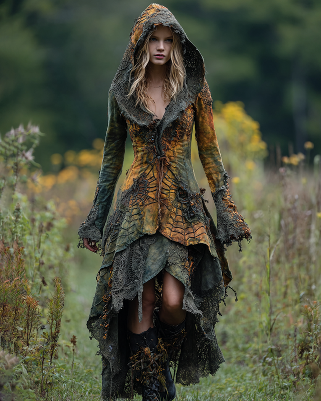 Halloween Themed Irregular Gradient Spiderweb Embroidery Lace Patchwork Hooded Dress 40f9
