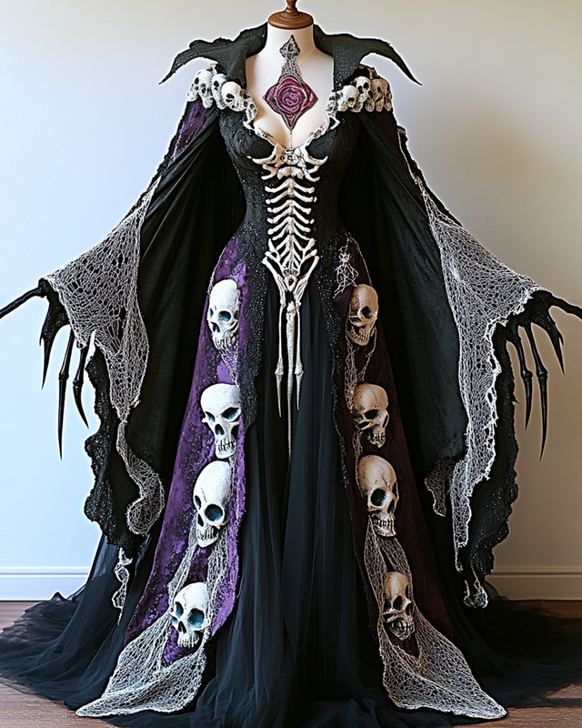 Halloween-Themed Contrast-Color Skull Embroidered Lace Velvet Witch Dress 788e