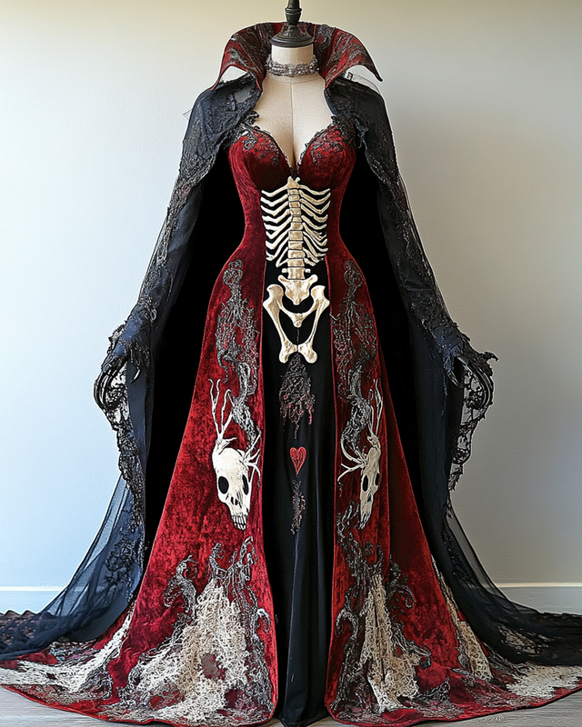 Halloween-Themed Contrasting Colors Spiderweb Embroidered Velvet Witch Dress cf71