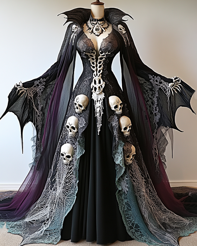 Halloween-Themed Gradient Skull Spiderweb Embroidered Lace Witch Dress e492