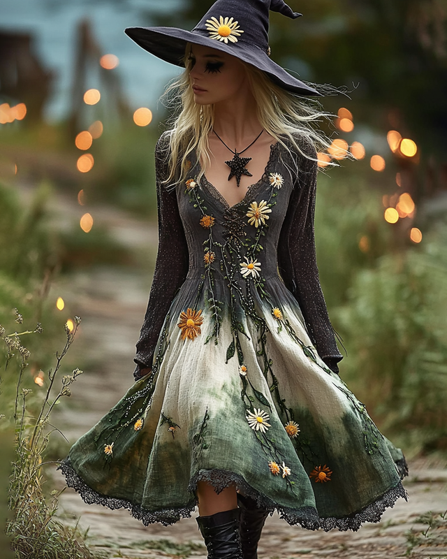 Halloween Themed Tie-dye Ombre Daisy Embroidered Witch Dress fd13