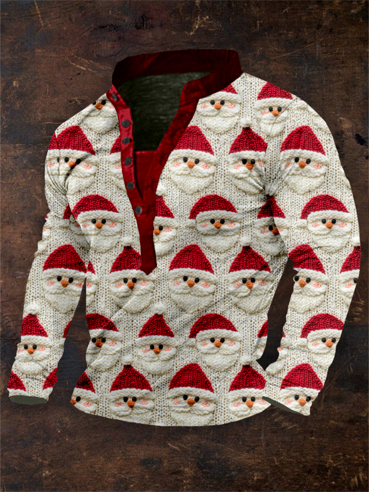 Men's Vintage Christmas Santa Claus Embroidered Henley Shirt