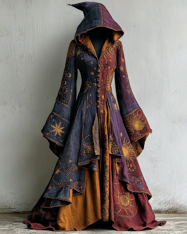 Halloween Themed Star And Moon Embroidery Patchwork Hooded Witch Dress 02c2