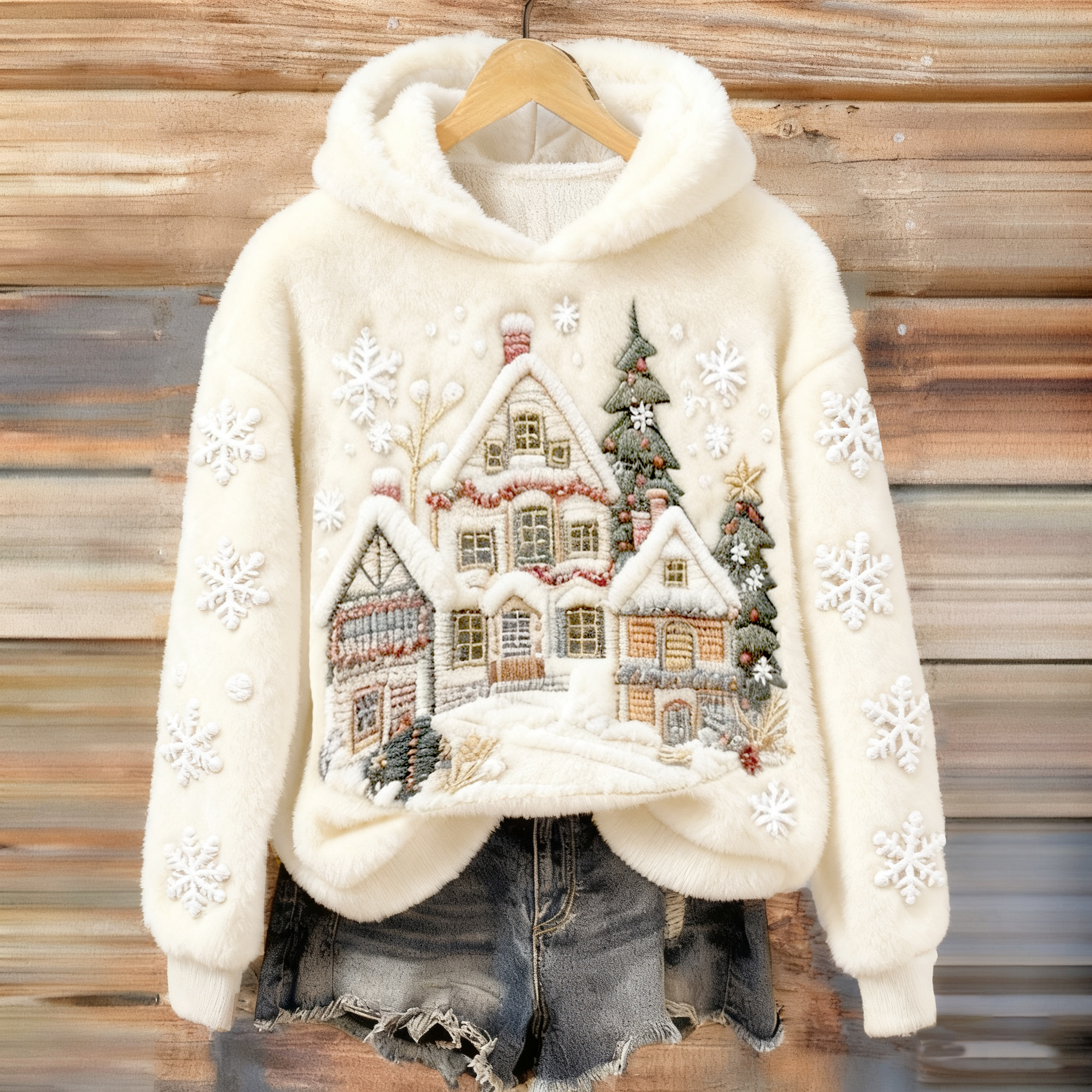 Women's Christmas Snow Scene Embroidery Comfort Flannel Hoodie