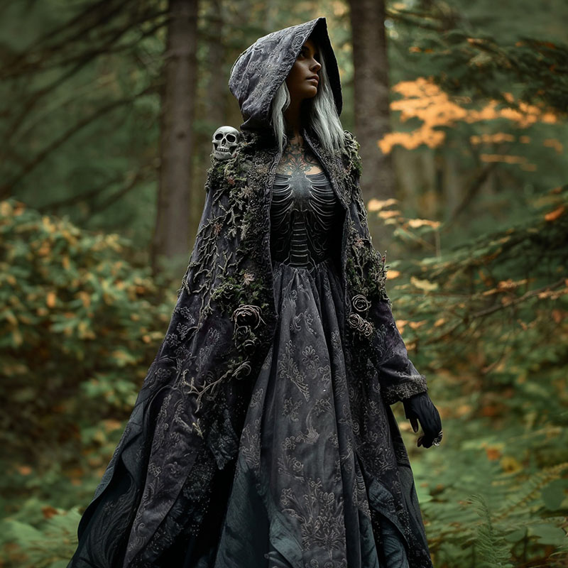 Women's Halloween Embroidered Gothic Skull Branch Hooded Long Cape