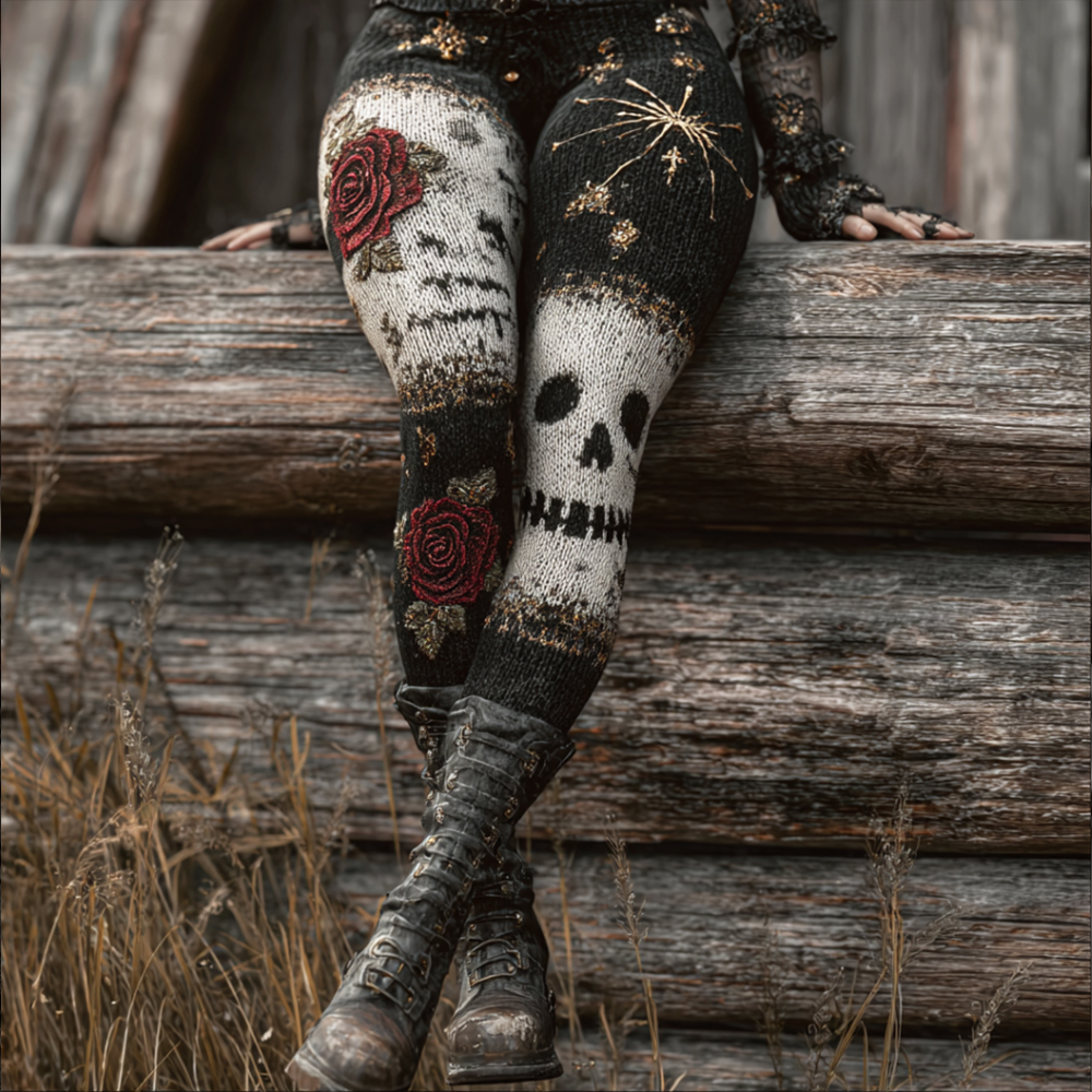 Women's Halloween Embroidered Patchwork Skull Face And Rose Pants