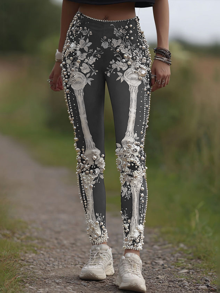 Women's Vintage Halloween Skeleton Embroidery Art Leggings